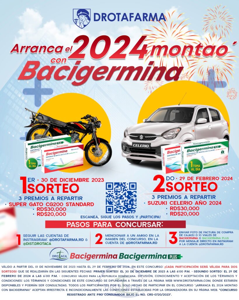 - Concurso aplicable únicamente por la compra mínima de 1 caja o de 10 viales de Bacigermina o Bacigermina Plus de Drotafarma.